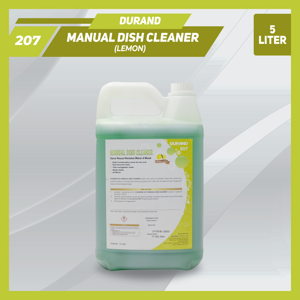 DURAND 207 MANUAL DISH CLEANER adalah formula larutan yang khusus digunakan untuk mencuci peralatan makan & peralatan masak di area dapur secara manual yaitu menggunakan tangan. Produk ini punya daya kerja yang kuat sehingga membersihkan peralatan dengan sangat baik. Cocok untuk memenuhi kebutuhan pembersih sehari-hari yang ekonomis, praktis serta higienis.