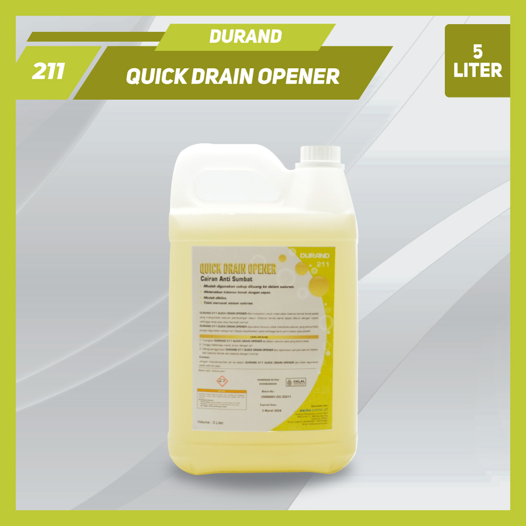 DURAND 211 QUICK DRAIN OPENER diformulasikan untuk memotong kotoran lemak berat padat yang ditemukan pada saluran pembuangan dapur. Kotoran lemak berat tersebut larut dengan cepat, sehingga kerja pipa akan kembali normal